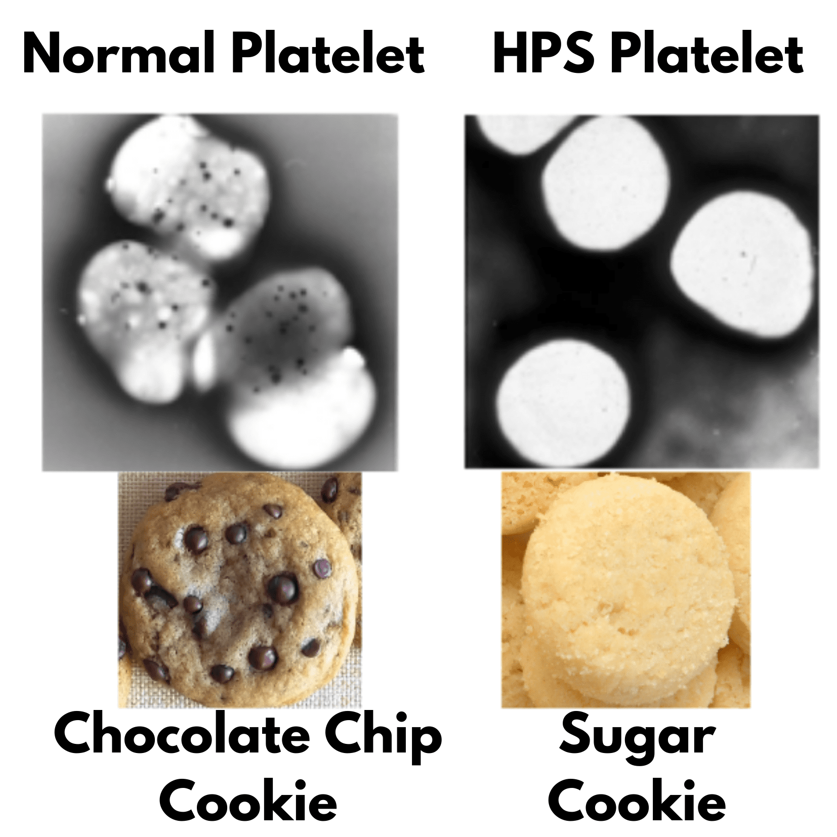 The first step in diagnosis is to analyze the prepared platelets under the electron microscope. A normal functioning platelet looks like a chocolate chip cookie; it has “dots”, these are the dense body granules that contain chemicals that are released when there is an injury. The chemicals help the platelets clump together to form a blood clot. An HPS platelet looks like a sugar cookie; it is missing the dense body granules; the “dots”, that allow the blood to clot properly. It is identifying the lack of dots that gives a definitive diagnosis of Hermansky-Pudlak Syndrome.